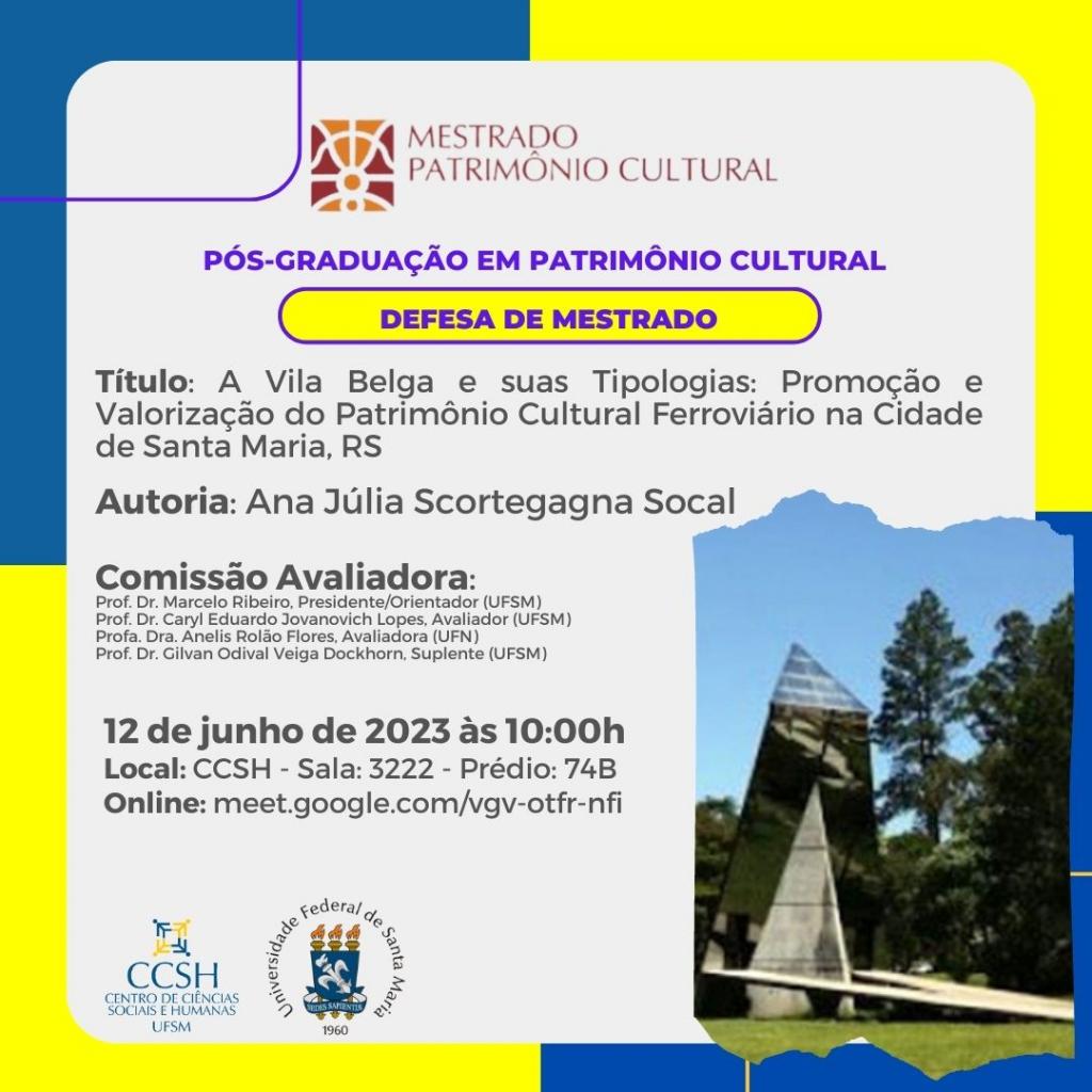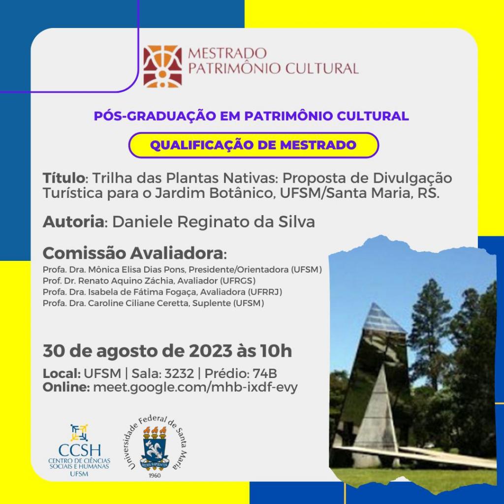 O Programa de Pós-Graduação em Patrimônio Cultural divulga a banca de Defesa de mestrado da aluna Alizandra da Silva Danzmann, com…