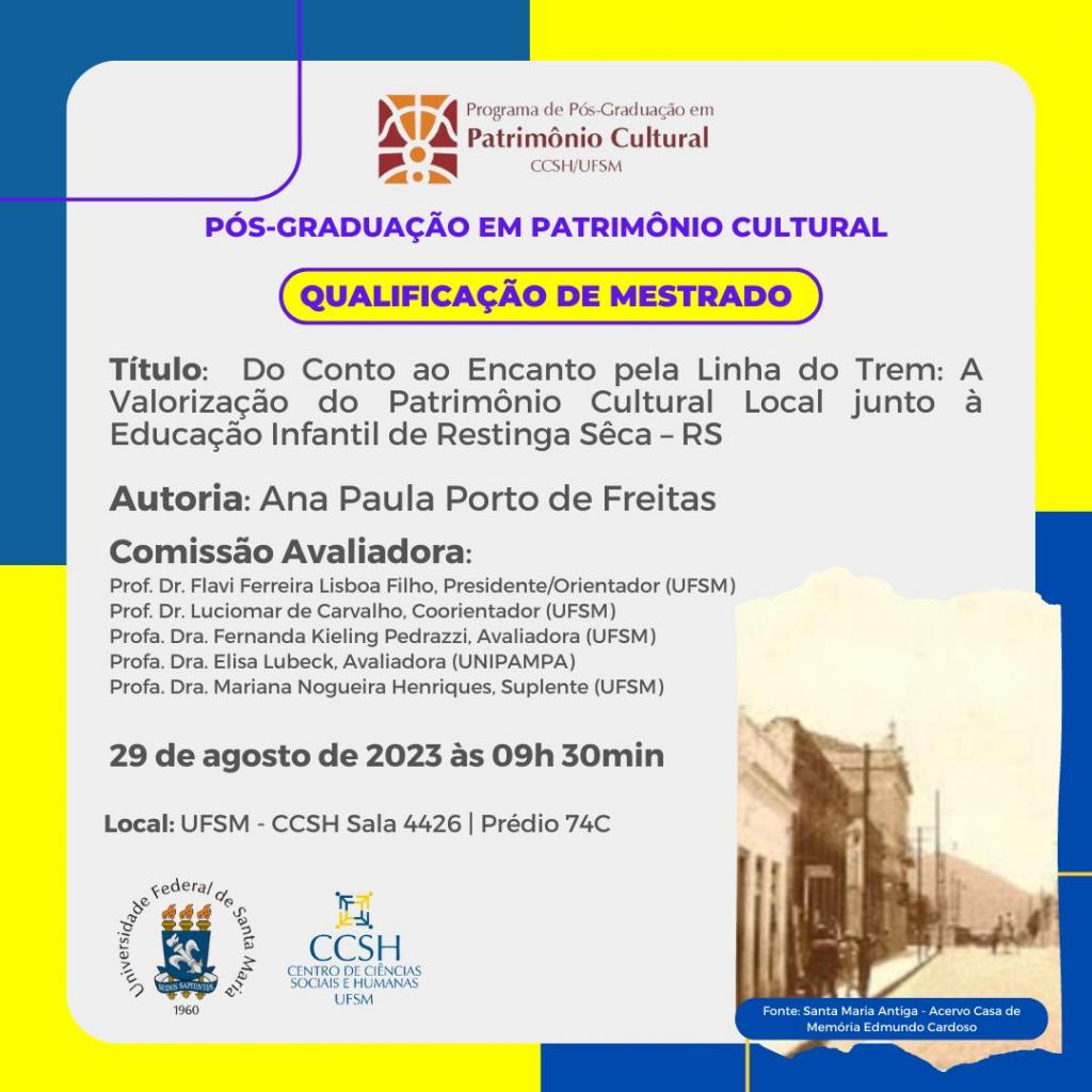 O Programa de Pós-Graduação em Patrimônio Cultural divulga a banca de Defesa de mestrado da aluna Andressa Tatiele Pohlmann, com o título “Raízes…