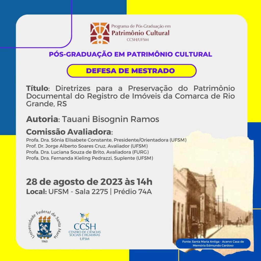 O Programa de Pós-Graduação em Patrimônio Cultural divulga a banca de Defesa de mestrado da aluna Danusa Frazzon da Cunha, com…
