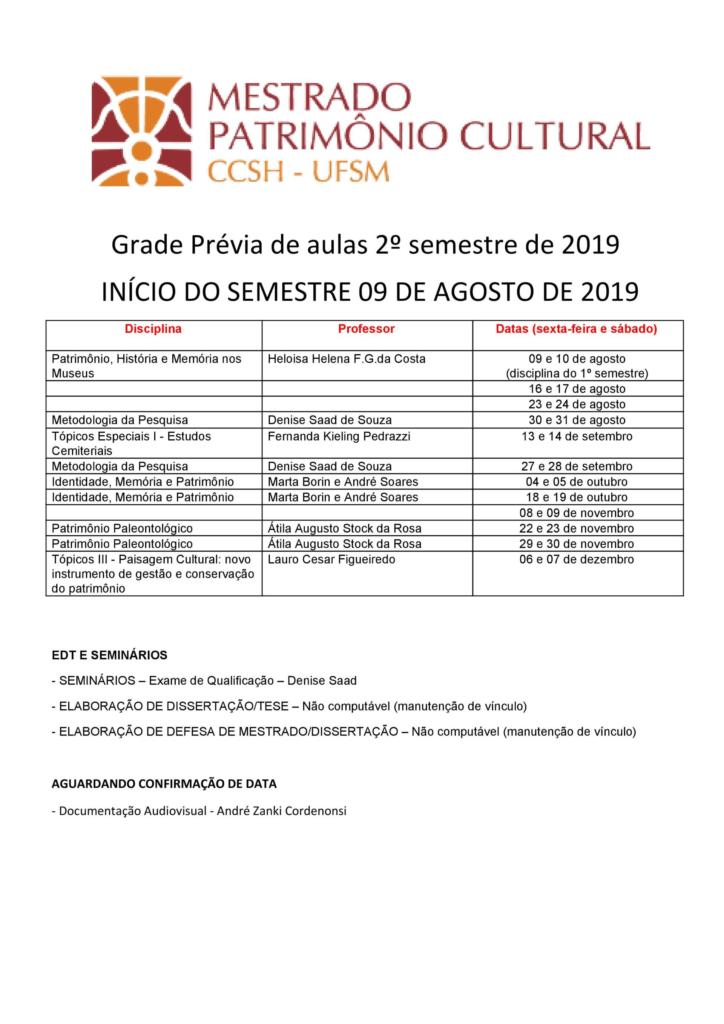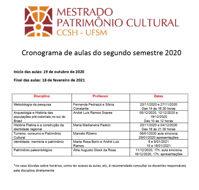 O curso de Pós-Graduação em Patrimônio Cultural está localizado em Campus Camobi – UFSM na modalidade Mestrado – Presencial sendo Integral o seu turno de funcionamento. A área de conhecimento do curso é classificada como MULTIDISCIPLINAR. Atualmente, a coordenação é de responsabilidade de JORGE ALBERTO SOARES CRUZ, a coordenação substituta de NEILA SILVIA PEREIRA DOS SANTOS RICHARDS e a secretaria de RUBE AFONSO RODRIGUES NETO.