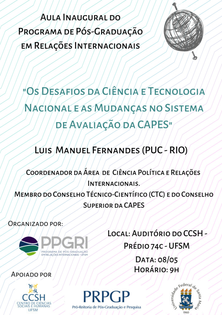 O PPGPC divulga a Aula Inaugural do PPG- Relações Internacionais da UFSM, que contará com a presença do Prof. Luis Manuel Fernandes (PUC-RIO/UFRJ), no dia 08/05 às 09:00 no auditório do 74C. O tema da palestra será “Os desafios da Ciência e Tecnologia Nacional e as mudanças no sistema de avaliação da CAPES“.