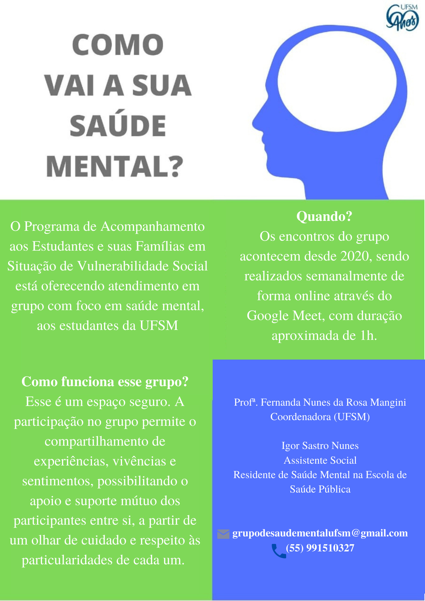 Os canais de atendimento são o e-mail grupodesaudementalufsm@gmail.com e o telefone/Whatsapp (55) 991510327.