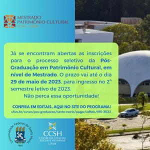 - Edital Específico da Seleção de Mestrado em Patrimônio Cultural – Ingresso no 2º semestre de 2023 (1ª Janela)