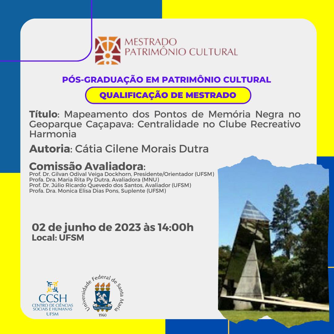 O Programa de Pós-Graduação em Patrimônio Cultural divulga a banca de Defesa de Mestrado da aluna Cátia Cilene Morais Dutra, com o títuloMapeamento dos Pontos de Memória Negra no Geoparque Caçapava: Centralidade no Clube Recreativo Harmonia que ocorrerá 02 de junho de 2023, às 14:00h na UFSM.