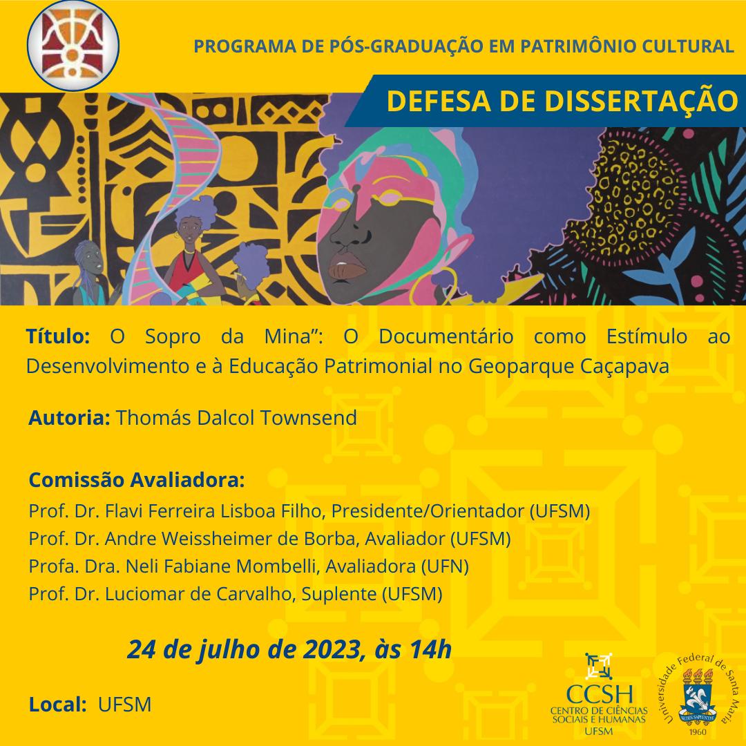 O Programa de Pós- Graduação em Patrimônio Cultural divulga a defesa de dissertação de mestrado do aluno Thomás Dalcol Townsend, com o título “”O Sopro da Mina”: O Documentário como Estímulo ao Desenvolvimento e à Educação Patrimonial no Geoparque” Caçapava que ocorrerá no dia 24 de julho na UFSM.
