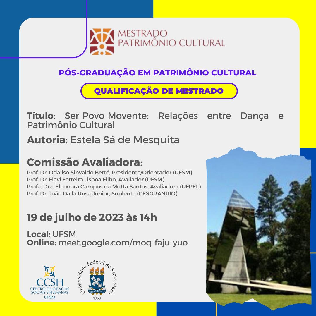 O Programa de Pós-Graduação em Patrimônio Cultural divulga a banca de qualificação de mestrado da aluna Estela Sá de Mesquita, com o título “Ser-Povo-Movente: Relações entre Dança e Patrimônio Cultural”, que ocorrerá no dia 19 de julho de 2023, às 14 horas, na UFSM. (Videoconferência: https://meet.google.com/moq-faju-yuo).