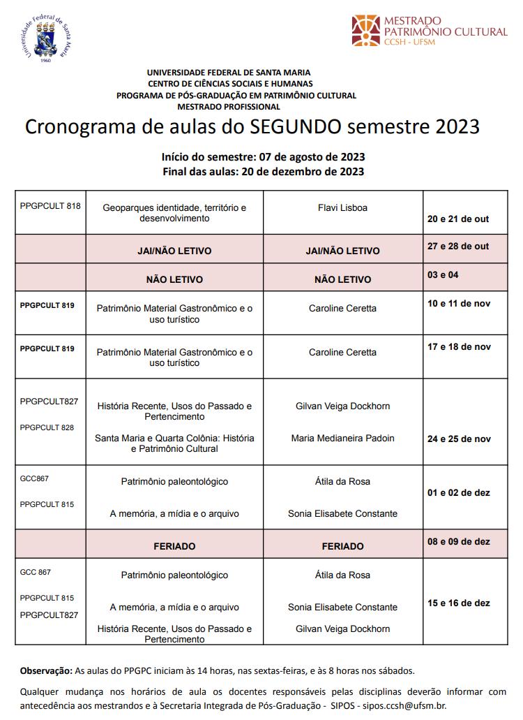 O Programa de Pós-Graduação em Patrimônio Cultural divulga o horário previsto para as aulas do segundo semestre de 2023: