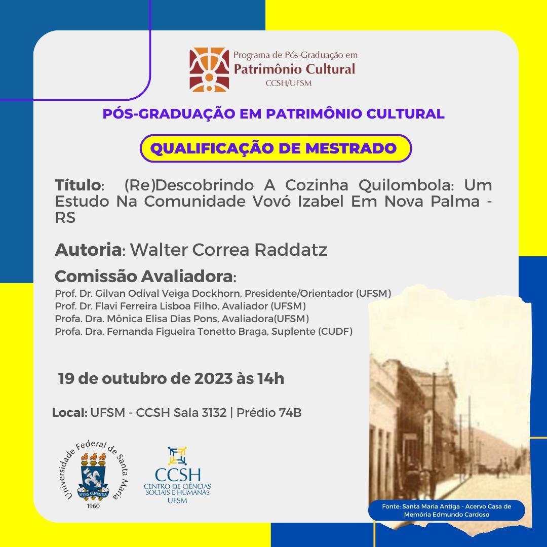 O Programa de Pós-Graduação em Patrimônio Cultural divulga a banca de qualificação de mestrado do aluno Walter Correa Raddatz, com o título “(Re)Descobrindo A Cozinha Quilombola: Um Estudo Na Comunidade Vovó Izabel Em Nova Palma – RS”, que ocorrerá no dia 19 de outubro, às 14 horas, na sala 3132do Prédio 74B do CCSH.
