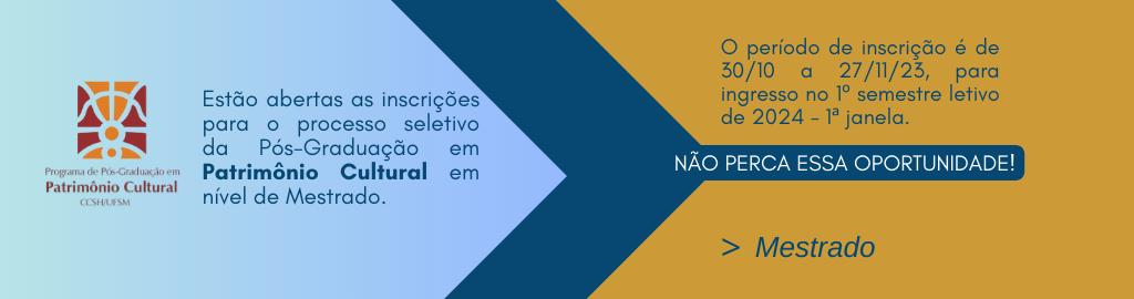 Mestrado m Patrimônio Cultural – Edital Específico: https://www.ufsm.br/app/uploads/sites/345/2023/10/MEST_PATRICULT_031_2023.pdf