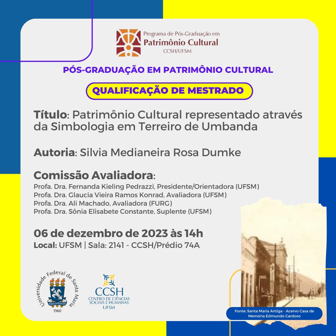O Programa de Pós-Graduação em Patrimônio Cultural divulga a banca de qualificação de mestrado da aluna Silvia Medianeira Rosa Dumke, com o título “Patrimônio Cultural representado através da Simbologia em Terreiro de Umbanda”, que ocorrerá no dia 6 de dezembro, às 14 horas na sala 2141, Prédio 74A