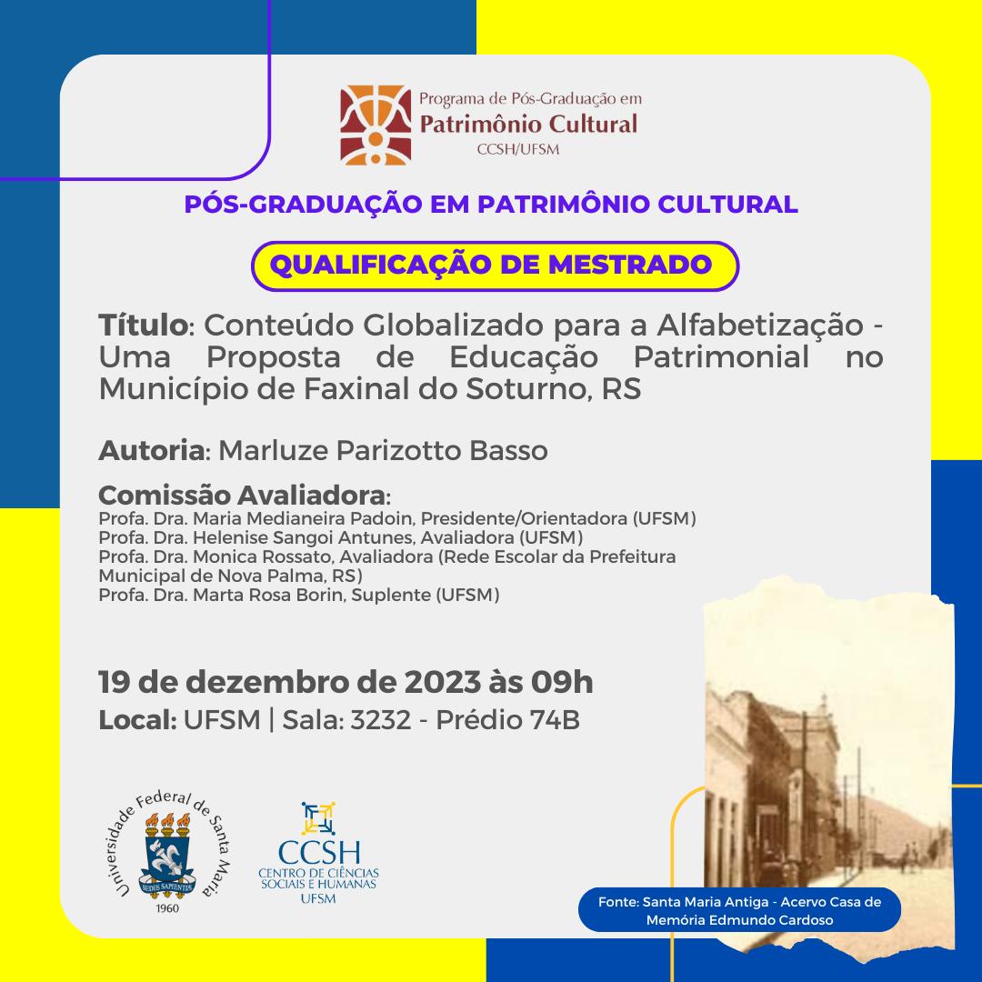 O Programa de Pós-Graduação em Patrimônio Cultural divulga a banca de qualificação de mestrado da aluna Marluze Parizotto Basso, com o título “Conteúdo Globalizado para a Alfabetização – Uma Proposta de Educação Patrimonial no Município de Faxinal do Soturno, RS”, que ocorrerá no dia 19 de dezembro, às 09 horas, na sala 3232 do prédio 74B, CCSH/UFSM.