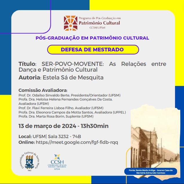 O Programa de Pós-Graduação em Patrimônio Cultural divulga a banca de defesa de mestrado da aluna  Estela Sá de Mesquita, com o título “SER-POVO-MOVENTE: As Relações entre Dança e Patrimônio Cultural”, que ocorrerá no dia 13 de março, às 13h 30min horas, na UFSM| Sala 3232 – 74B | https://meet.google.com/fgf-fidb-rqq.