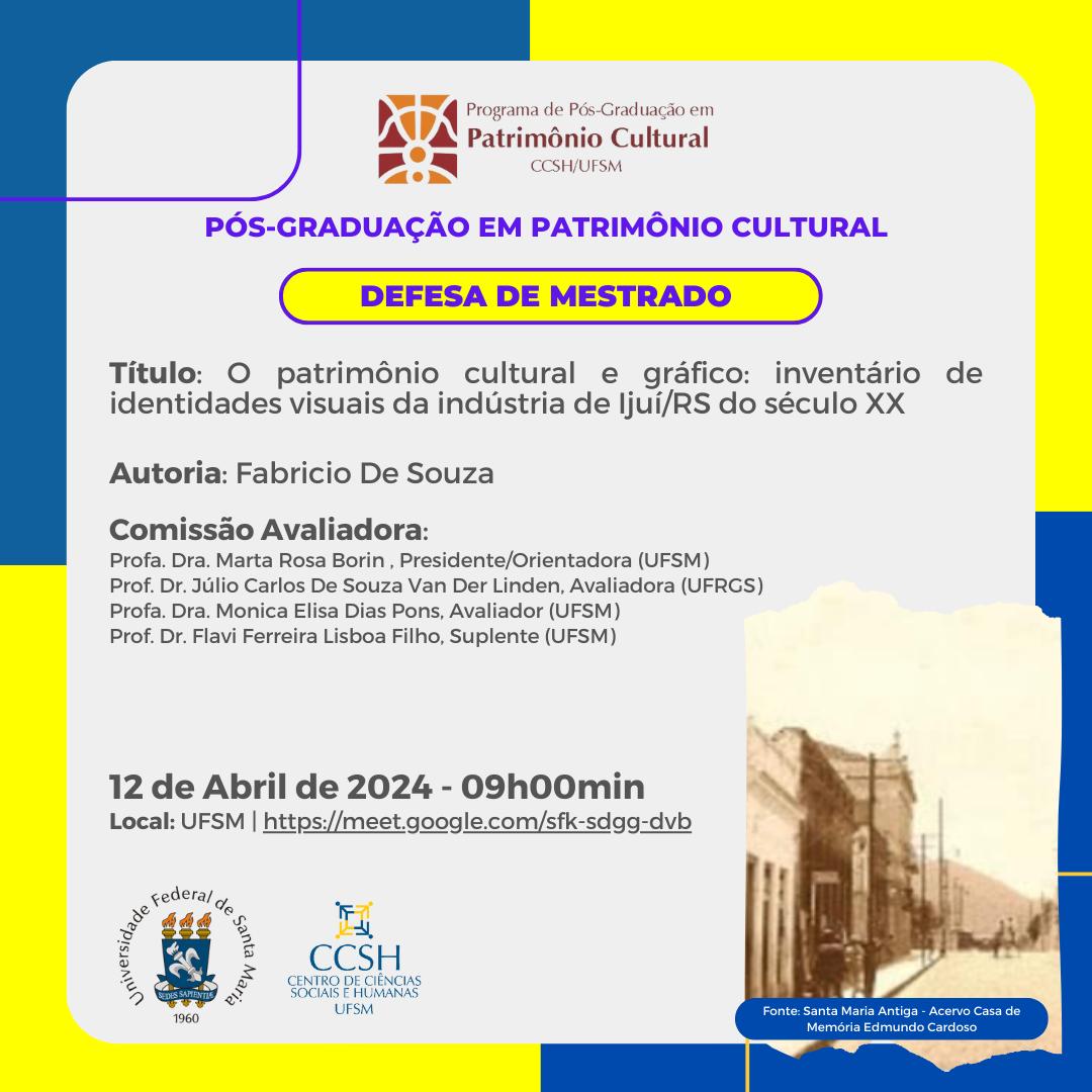 O Programa de Pós-Graduação em Patrimônio Cultural divulga a banca de defesa de mestrado do aluno Fabricio De Souza, com o título “O patrimônio cultural e gráfico: inventário de identidades visuais da indústria de Ijuí/RS do século XX”, que ocorrerá no dia 12 de Abril, às 09h, na UFSM | https://meet.google.com/sfk-sdgg-dvb.