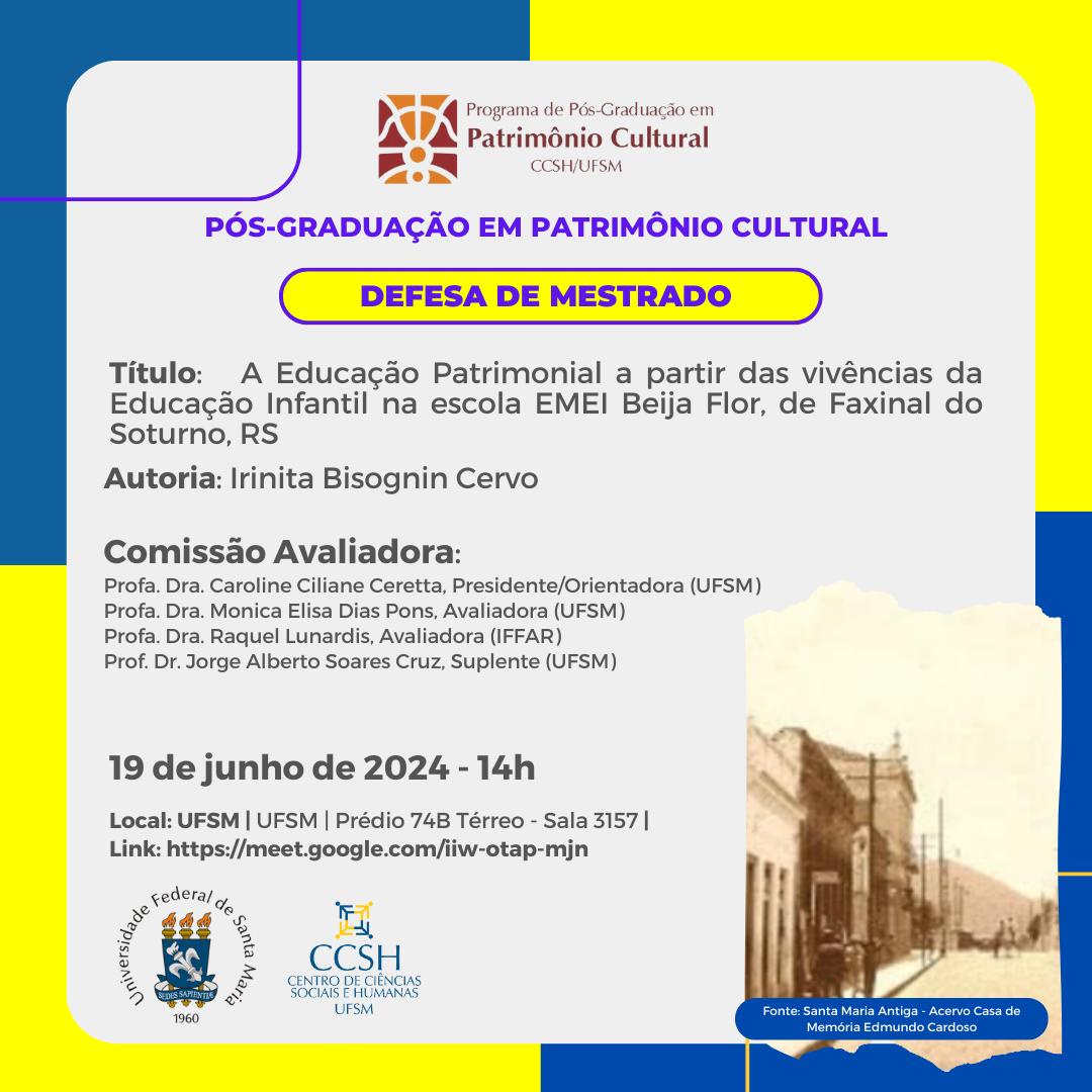 O Programa de Pós-Graduação em Patrimônio Cultural divulga a banca de defesa de mestrado da aluna  Irinita Bisognin Cervo, com o título “A Educação Patrimonial a partir das vivências da Educação Infantil na escola EMEI Beija Flor, de Faxinal do Soturno, RS”, que ocorrerá no dia 19 de Junho de 2024, às 14h, na UFSM | Sala 3157 – 74B | Link para videoconferência:  https://meet.google.com/iiw-otap-mjn