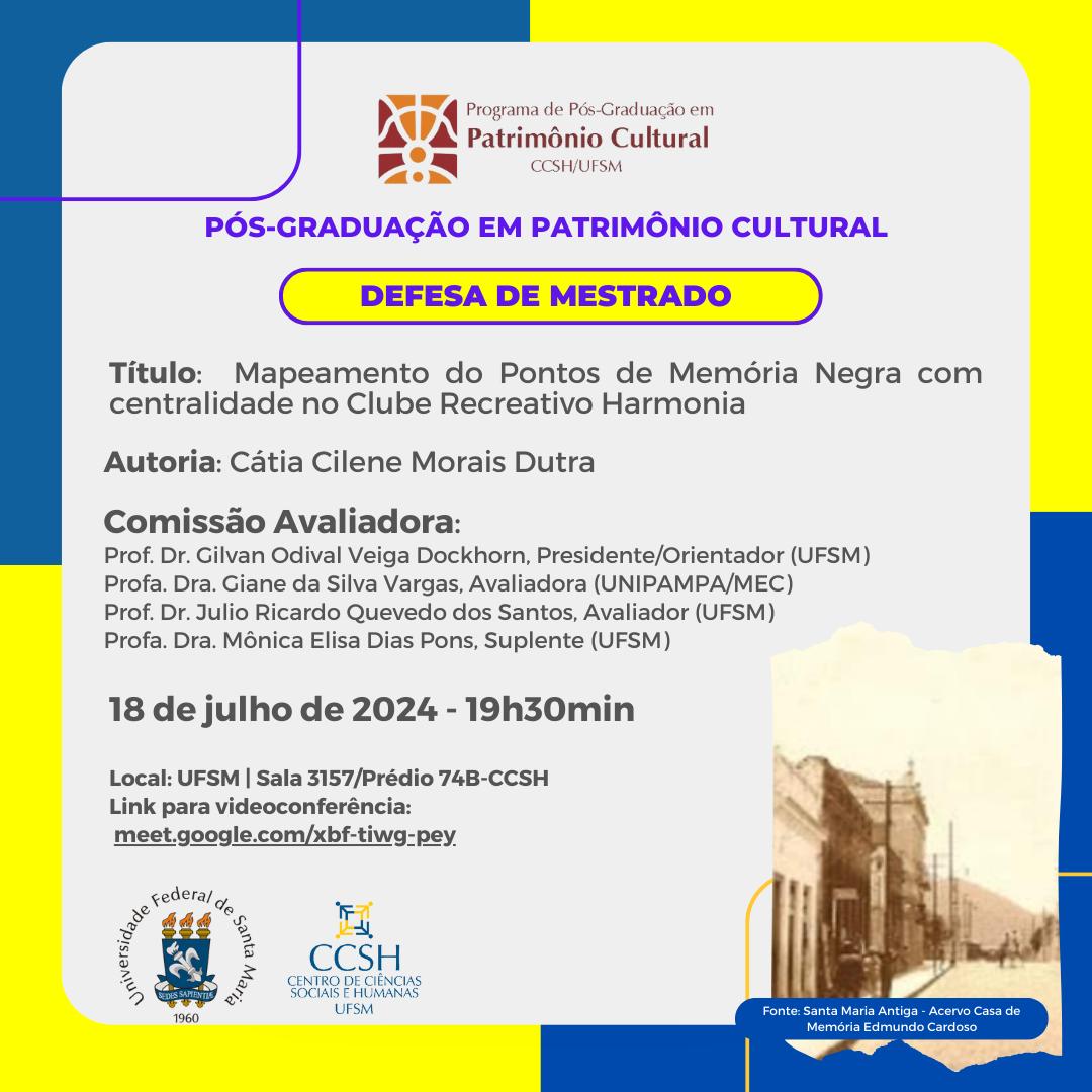 O Programa de Pós-Graduação em Patrimônio Cultural divulga a banca de defesa de mestrado da aluna Cátia Cilene Morais Dutra, com o título “Mapeamento do Pontos de Memória Negra com centralidade no Clube Recreativo Harmonia”, que ocorrerá no dia 18 de Julho de 2024, às 19h30min, na UFSM | Sala 3157 – 74B
