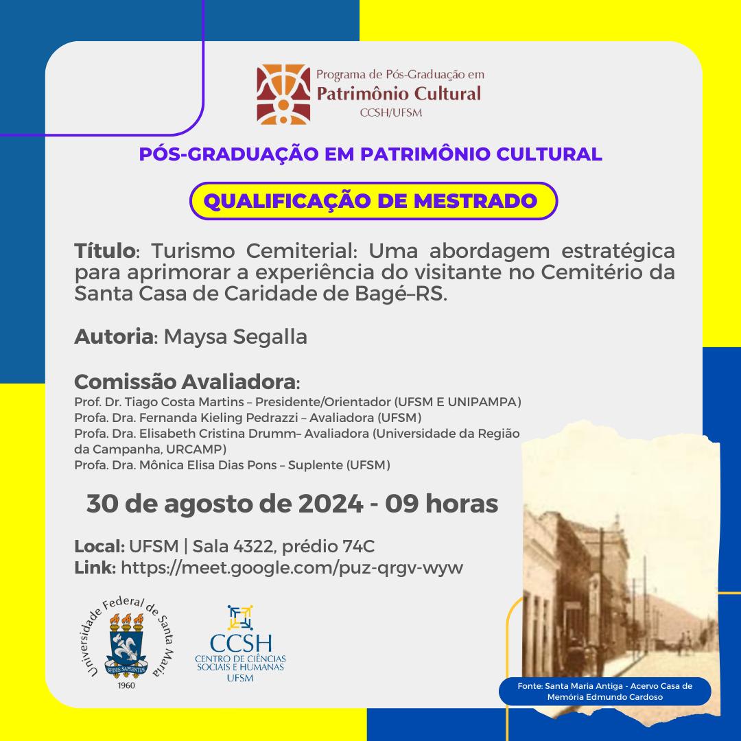 O Programa de Pós-Graduação em Patrimônio Cultural divulga a banca de defesa de qualificação de mestrado da aluna Maysa Segalla, com o título “Turismo Cemiterial: Uma abordagem estratégica para aprimorar a experiência do visitante no Cemitério da Santa Casa de Caridade de Bagé–RS.”, que ocorrerá no dia 30 de agosto, às 09h, na UFSM de forma híbrida, na sala 4322 do Prédio 74C e por videoconferência através do link: https://meet.google.com/puz-qrgv-wyw