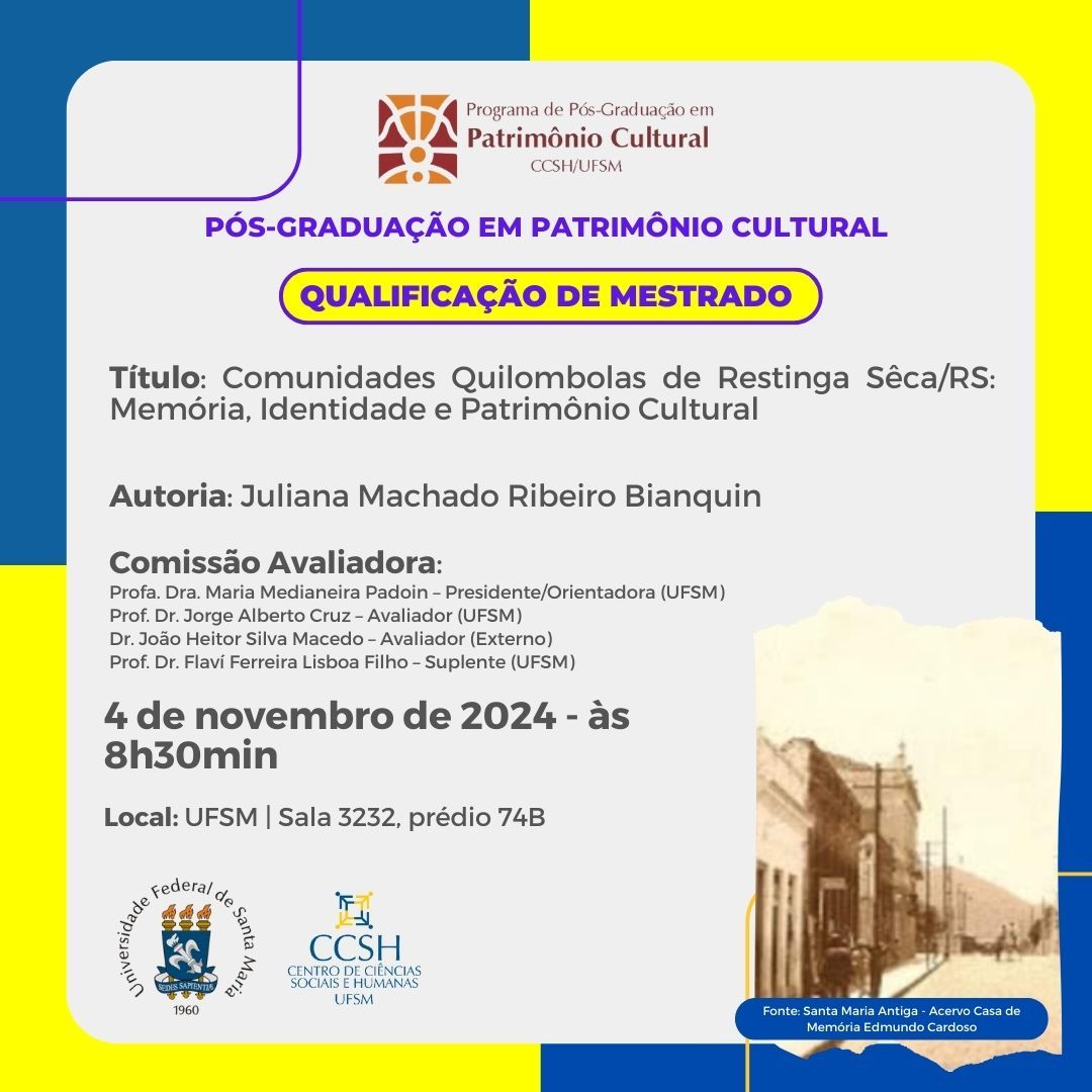 O Programa de Pós-Graduação em Patrimônio Cultural divulga a banca de defesa de qualificação de mestrado da aluna Juliana Machado Ribeiro Bianquin, com o título “Comunidades Quilombolas de Restinga Sêca/RS: Memória, Identidade e Patrimônio Cultural”, que ocorrerá no dia 04 de novembro, às 08h30min.