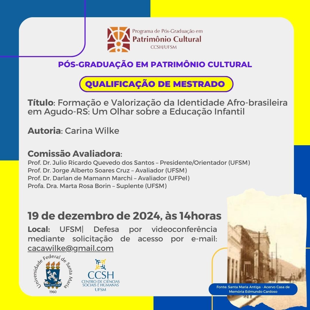 O Programa de Pós-Graduação em Patrimônio Cultural divulga a banca de defesa de qualificação de mestrado da aluna Carina Wilke , com o título “Formação e Valorização da Identidade Afro-brasileira em Agudo-RS: Um Olhar sobre  a Educação Infantil”, que ocorrerá no dia 19 de dezembro, às 14horas.