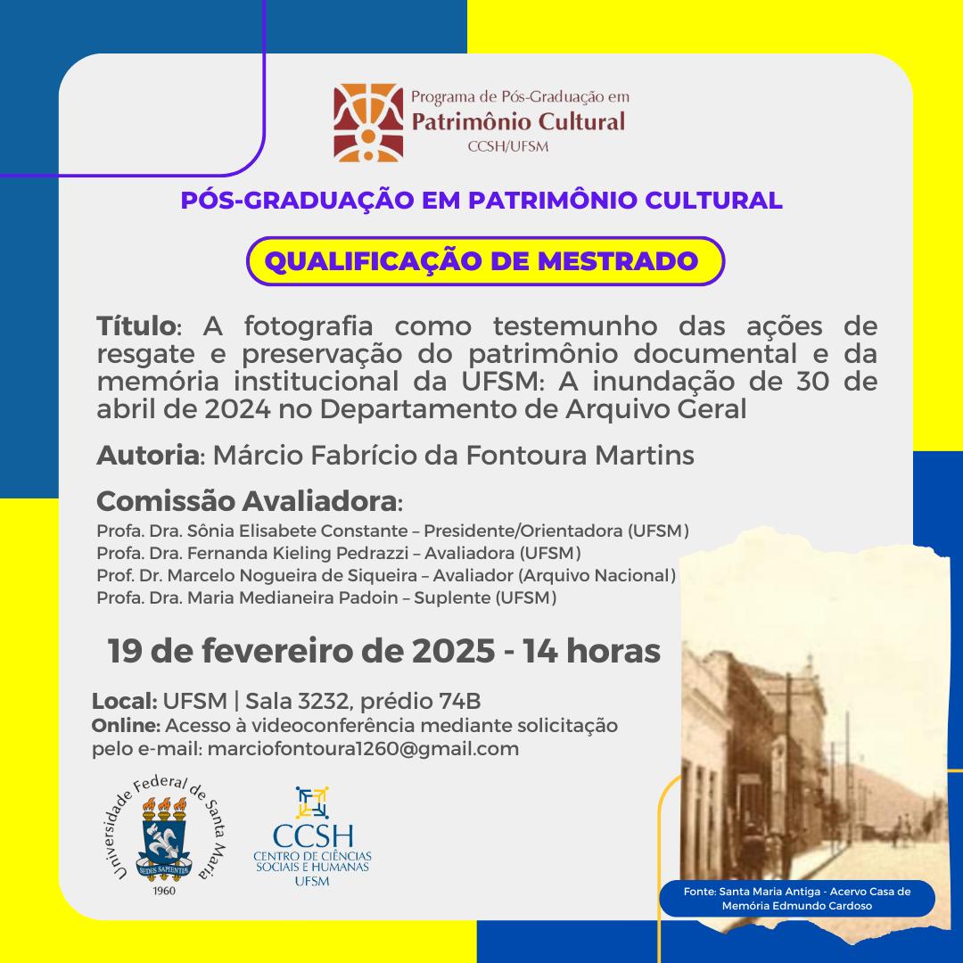 O Programa de Pós-Graduação em Patrimônio Cultural divulga a banca de defesa de qualificação de mestrado do aluno Márcio Fabrício da Fontoura Martins, com o título “A fotografia como testemunho das ações de resgate e preservação do patrimônio documental e da memória institucional da UFSM: A inundação de 30 de abril de 2024 no Departamento de Arquivo Geral”, que ocorrerá no dia 19 de fevereiro de 2025, às 14 horas.