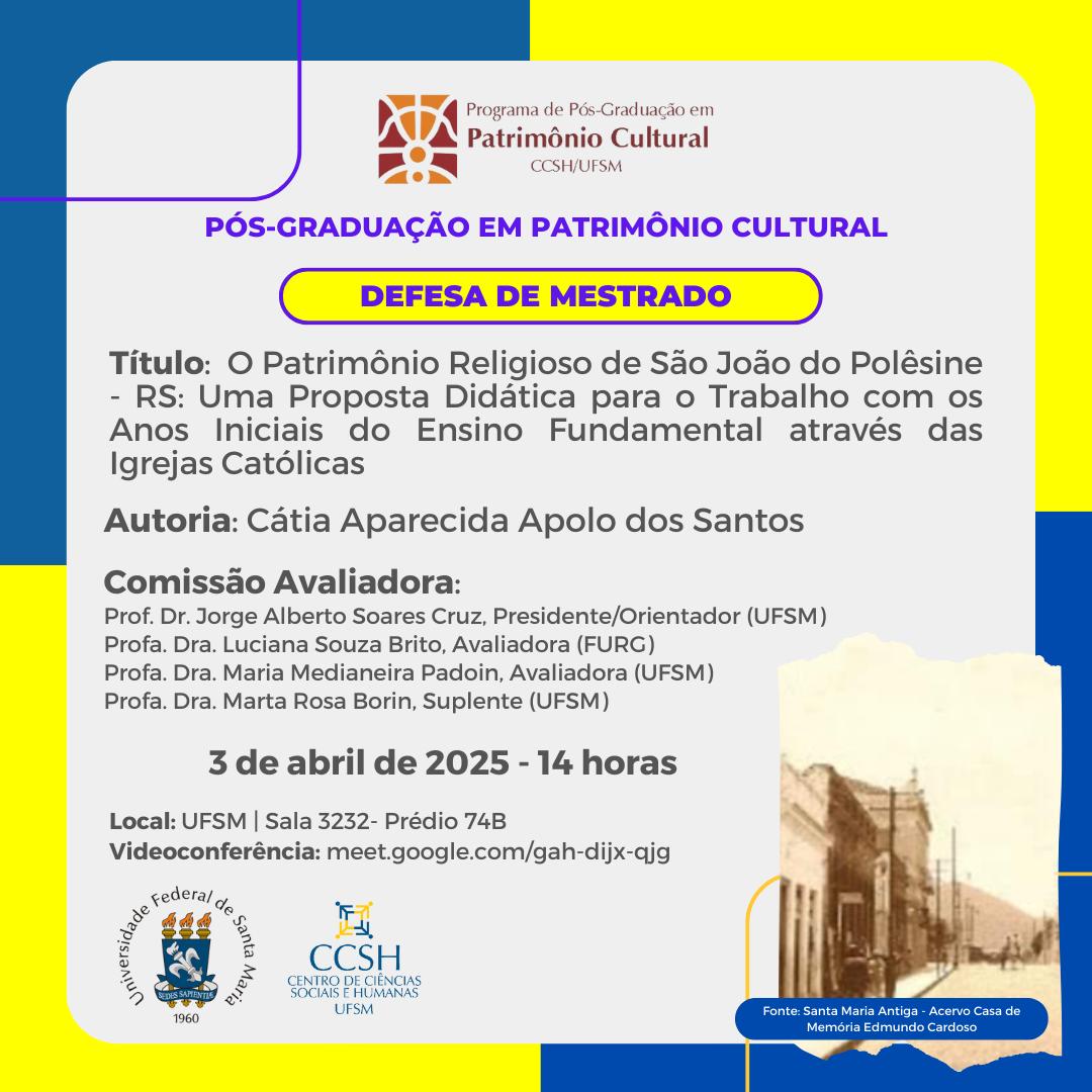 O Programa de Pós-Graduação em Patrimônio Cultural divulga a banca de defesa de mestrado da aluna Cátia Aparecida Apolo dos Santos, com o título “O Patrimônio Religioso de São João do Polêsine – RS: Uma Proposta Didática para o Trabalho com os Anos Iniciais do Ensino Fundamental através das Igrejas Católicas”, que ocorrerá no dia 3 de abril de 2025, às 14 horas, na sala 3232 do prédio 74B. Link para acesso à videoconferência: http://meet.google.com/gah-dijx-qjg.