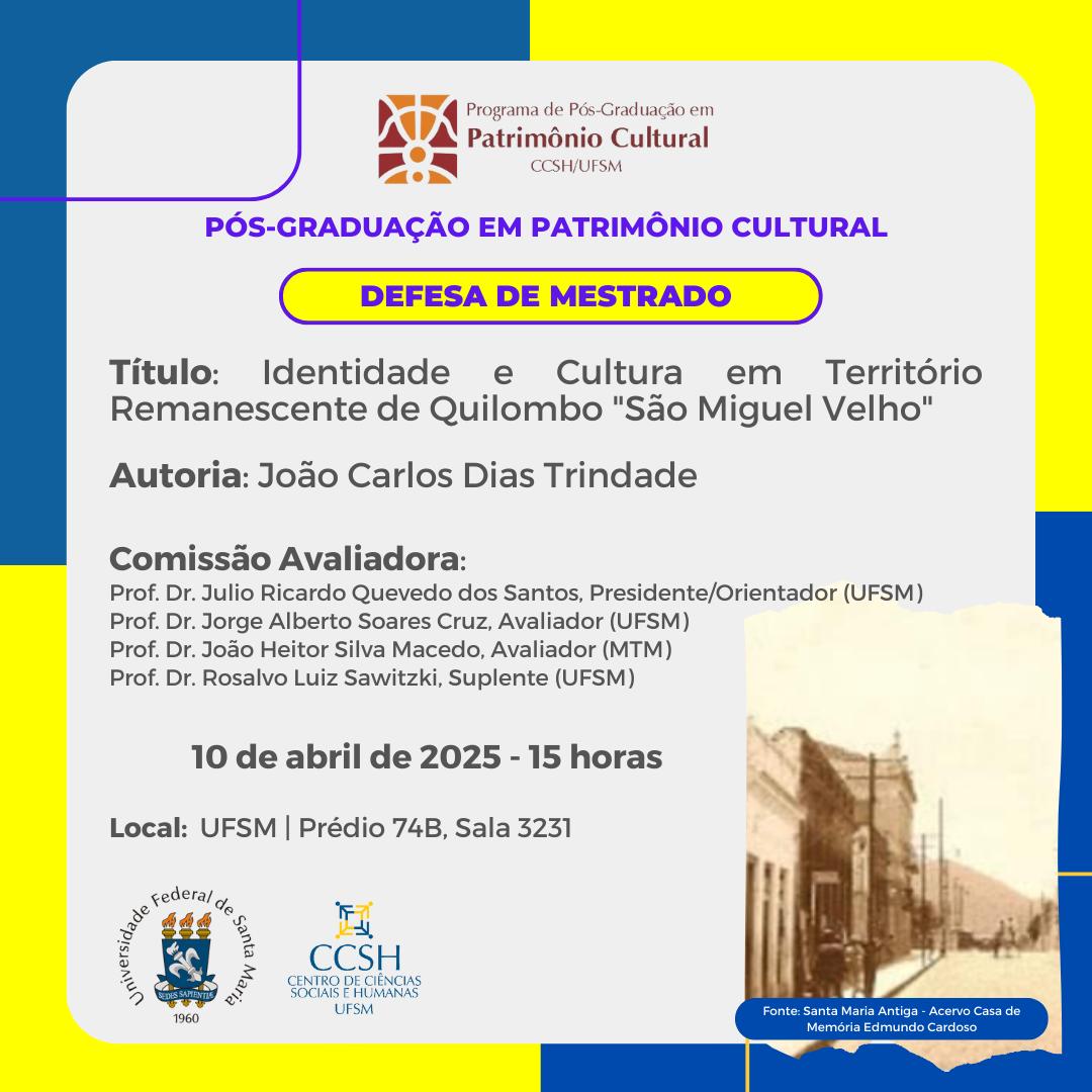 O Programa de Pós-Graduação em Patrimônio Cultural divulga a banca de defesa de mestrado do aluno João Carlos Dias Trindade, com o título “Identidade e Cultura em Território Remanescente de Quilombo ‘São Miguel Velho’”, que ocorrerá no dia 10 de abril de 2025, às 15 horas, na sala 3231 do prédio 74B, CCSH/UFSM.