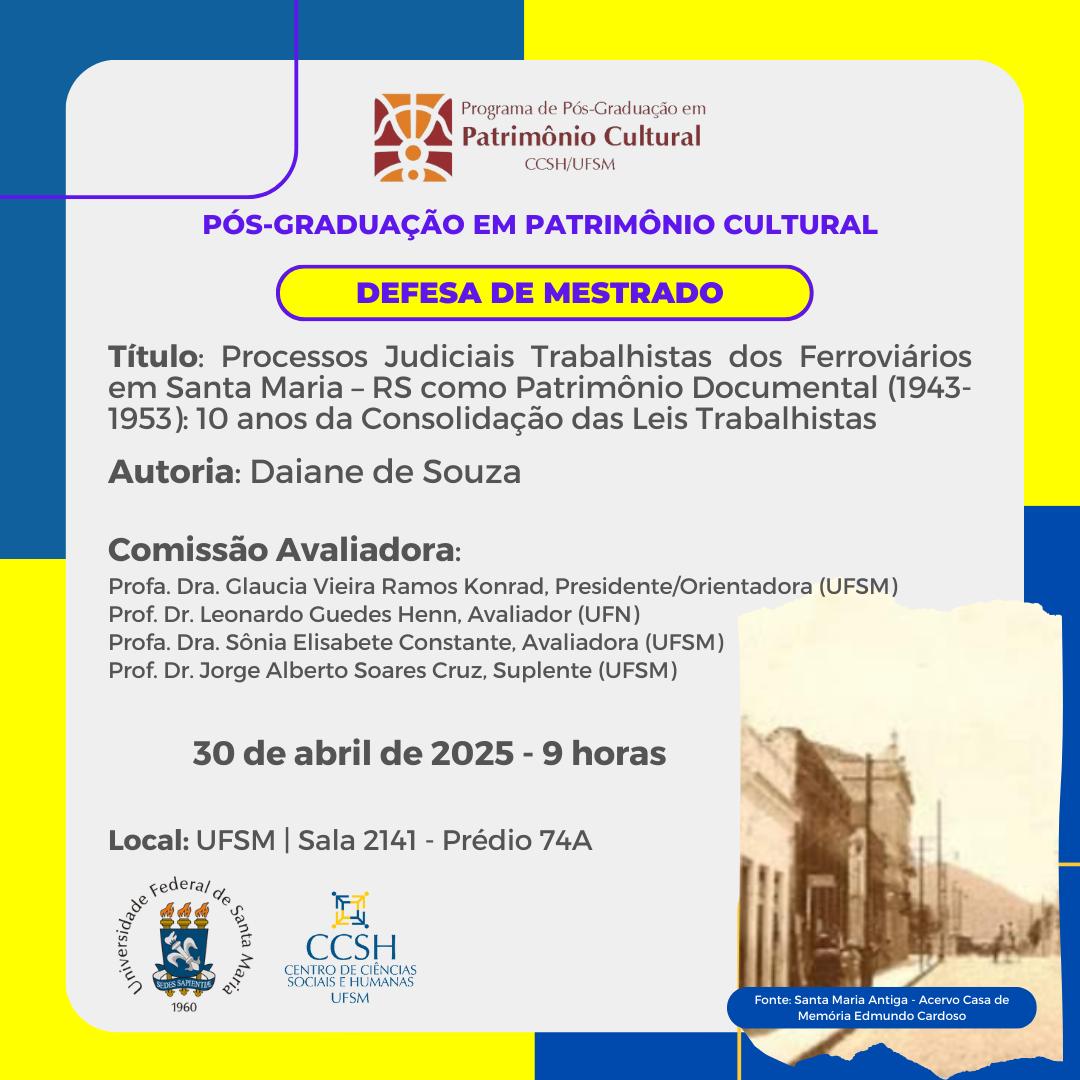 O Programa de Pós-Graduação em Patrimônio Cultural divulga a banca de defesa de mestrado da aluna Daiane de Souza, com o título “Processos Judiciais Trabalhistas dos Ferroviários em Santa Maria – RS como Patrimônio Documental (1943-1953): 10 anos da Consolidação das Leis Trabalhistas”, que ocorrerá no dia 30 de abril de 2025, às 9 horas, na sala 2141 do prédio 74A.