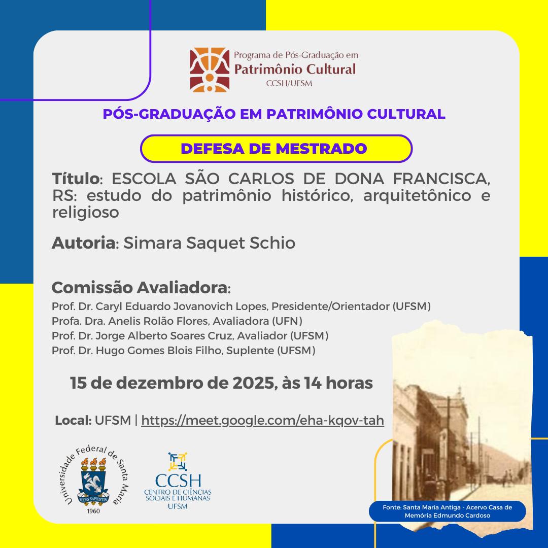 O Programa de Pós-Graduação em Patrimônio Cultural divulga a banca de Defesa de mestrado da aluna Simara Saquet Schis, com o título “ESCOLA SÃO CARLOS DE DONA FRANCISCA, RS: estudo do patrimônio histórico, arquitetônico e religioso”, que ocorrerá no dia 15 de dezembro de 2025, às 14 horas. UFSM | https://meet.google.com/eha-kqov-tah