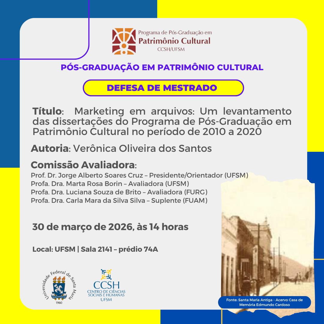 O Programa de Pós-Graduação em Patrimônio Cultural divulga a banca de Defesa de mestrado da aluna Verônica Oliveira dos Santos, com o título “Marketing em arquivos: Um levantamento das dissertações do Programa de Pós-Graduação em Patrimônio Cultural no período de 2010 a 2020”, que ocorrerá no dia 30 de março de 2026, às 14 horas  na UFSM, sala 2141, prédio 74A.