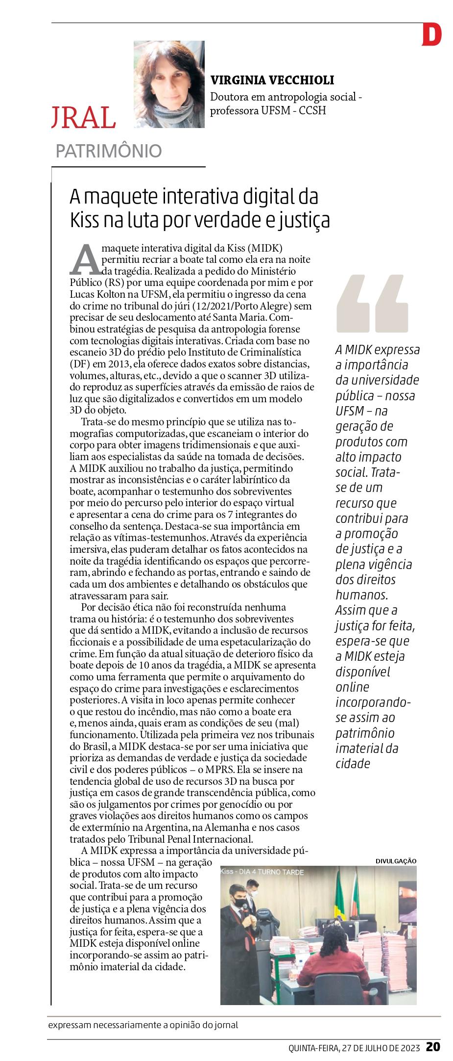 - A coluna “A tragédia da Kiss como patrimônio da cidade“, de autoria da Professora Virgínia Vecchioli, publicada no jornal Diário de Santa Maria, em 12 de janeiro de 2023