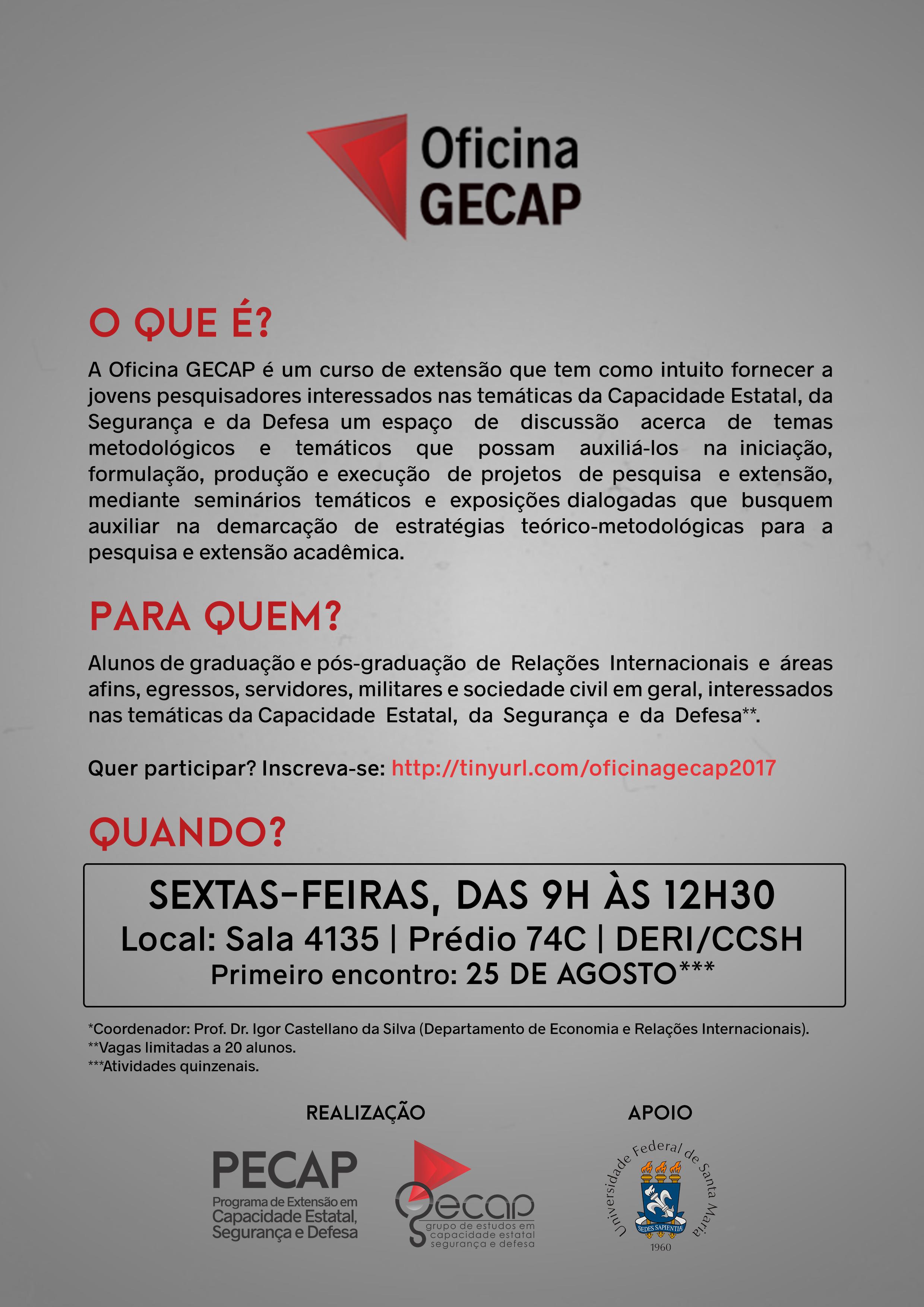 As atividades da Oficina GECAP iniciam na próxima sexta-feira, 25 de agosto, às 9h. A Oficina GECAP é um curso de extensão que tem como intuito auxiliar na formação acadêmica e intelectual de estudantes, jovens pesquisadores de cursos de graduação e pós-graduação, egressos da academia, servidores públicos, militares e sociedade civil em geral, interessados nas temáticas da Capacidade Estatal, da Segurança e da Defesa. Procura, assim, promover um espaço de discussão acerca de questões metodológicas, teóricas e temáticas que possam auxiliá-los para a realização de projetos de pesquisa e extensão.