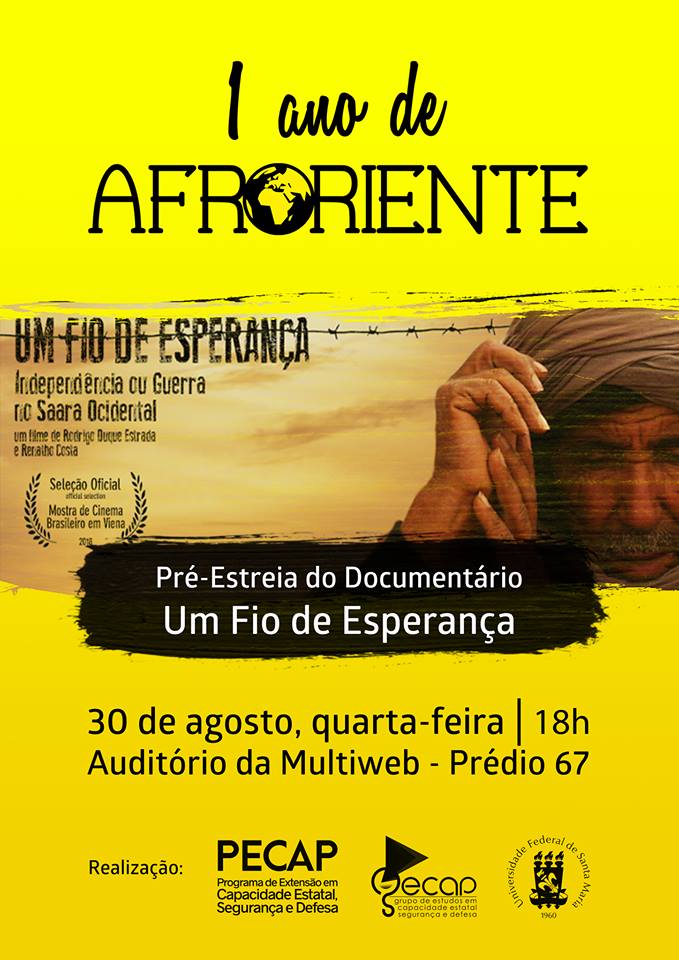 Na ultima quarta-feira (30), ocorreu no Auditório da Multiweb UFSM a pré-estreia do documentário “Um Fio de Esperança: Independência ou Guerra no Saara Ocidental” em comemoração ao primeiro ano de atividades do programa Afroriente da Rádio Universidade 800 AM, integrante do projeto de extensão Repensando a África e o Oriente Médio (REAO), coordenado pelo GECAP. O evento contou com a participação e palestra do co-diretor do documentário, Rodrigo Duque Estrada.