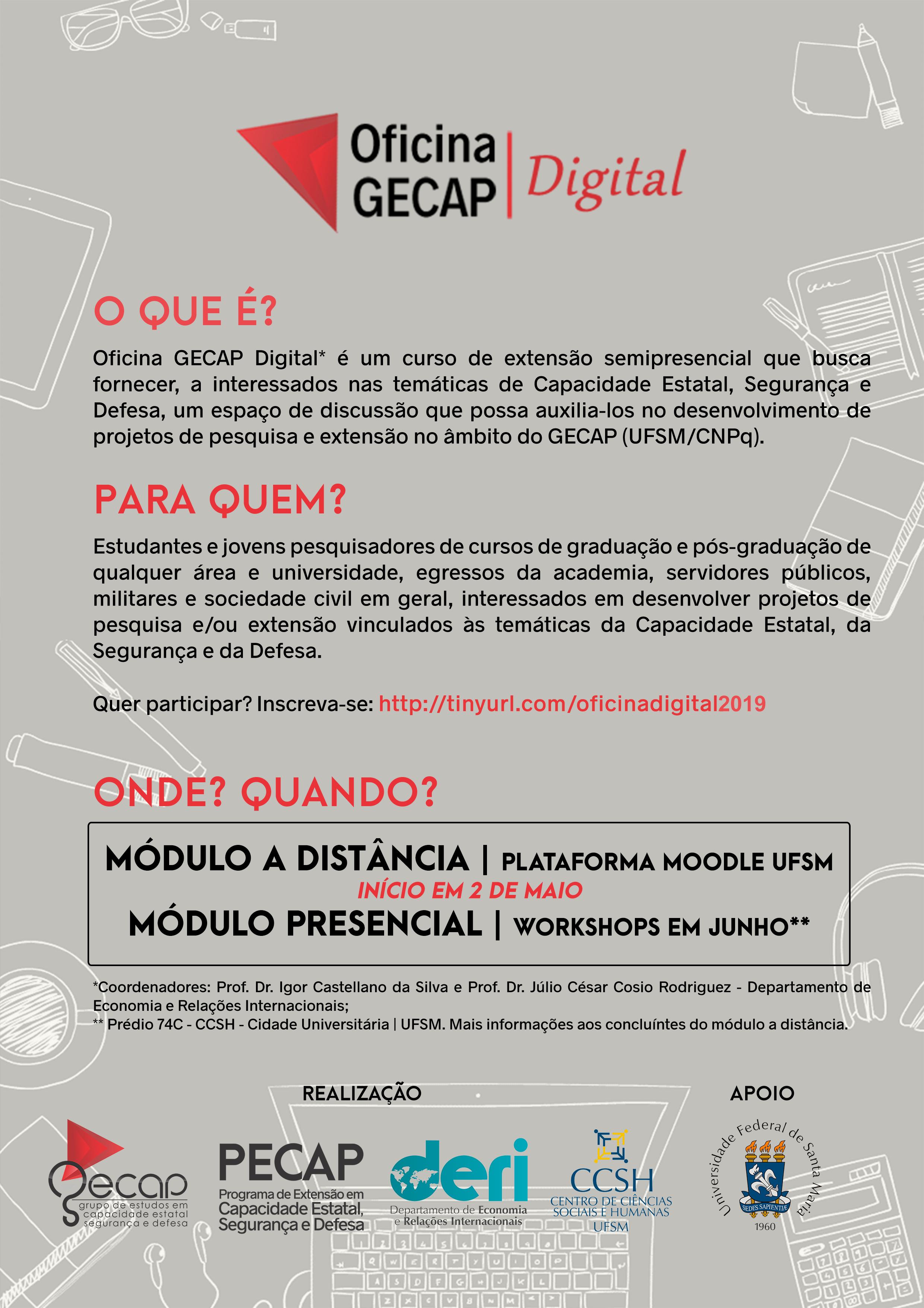 Estão abertas as inscrições para a edição de 2019 da Oficina GECAP Digital. Elas podem ser feitas até 26 de abril, sexta-feira, pelo formulário a seguir: tinyurl.com/oficinadigital2019. As aulas se iniciam dia 02 de maio na plataforma Moodle. Encontros presenciais ocorrerão em junho. As vagas são limitadas!