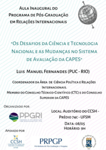 O Programa de Pós-Graduação em Relações Internacionais convida a todos/as para a sua Aula Inaugural intitulada “Os Desafios da Ciência e Tecnologia Nacional e as Mudanças no Sistema de Avaliação da Capes” que será ministrada pelo Prof. Dr. Luis Manuel Fernandes (PUC – RIO). O evento acontecerá no dia 08 de maio, às 9h, no Auditório do CCSH, localizado no prédio 74C da UFSM. As inscrições são gratuitas e serão feitas no evento, com a participação valendo 3h de ACG.