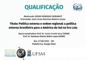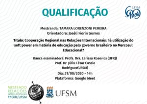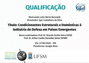 Ocorrerão na próxima segunda-feira, dia 31 de agosto de 2020, três bancas de Qualificação de Mestrado do Programa de Pós-graduação em Relações Internacionais da UFSM. As informações estão nas imagens em anexo. O link para participar das qualificações pode ser solicitado pelo e-mail do programa: ppgri.ufsm@gmail.com