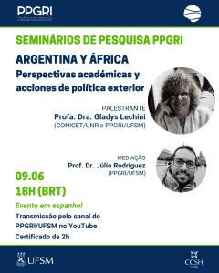 O PPGRI divulga o 2º encontro dos Seminários de Pesquisa do PPGRI/UFSM. Neste encontro, a ocorrer no dia 9 de junho, às 18h (BRT), a Profa. Dra. Gladys Lechini, docente vinculada ao CONICET-UNR e professora colaboradora do PPGRI/UFSM, ministrará a palestra intitulada “Argentina y África: Perspectivas académicas y acciones de política exterior”. A palestra será proferida em espanhol.
