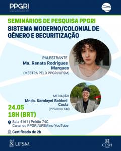 O PPGRI convida a todos/as/es para o 8º Encontro dos Seminários de Pesquisa do PPGRI/UFSM. A palestra intitulada “Sistema Moderno/Colonial de Gênero e Securitização”, será ministrada pela mestra Ma. Renata Rodrigues Marques, egressa do PPGRI/UFSM, e mediada pela discente do PPGRI, Karolayni Baldoni Costa, no dia 24 de maio, às 18h (BRT) presencialmente, na sala 4161 do Prédio 74C, CCSH, Campus Camobi da UFSM, com transmissão pelo youtube do PPGRI/UFSM.