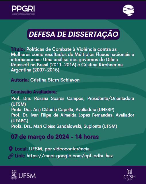 O Programa de Pós-Graduação em Relações Internacionais divulga a defesa de dissertação da aluna Cristina Stern Schiavon, com o título “Políticas de Combate à Violência contra as Mulheres como resultados de Múltiplos Fluxos nacionais e internacionais: Uma análise dos governos de Dilma Rousseff no Brasil (2011-2016) e Cristina Kirchner na Argentina (2007-2015)”, que ocorrerá no dia 07 de março de 2024, às 14 horas, por videoconferência: https://meet.google.com/epf-edbi-haz