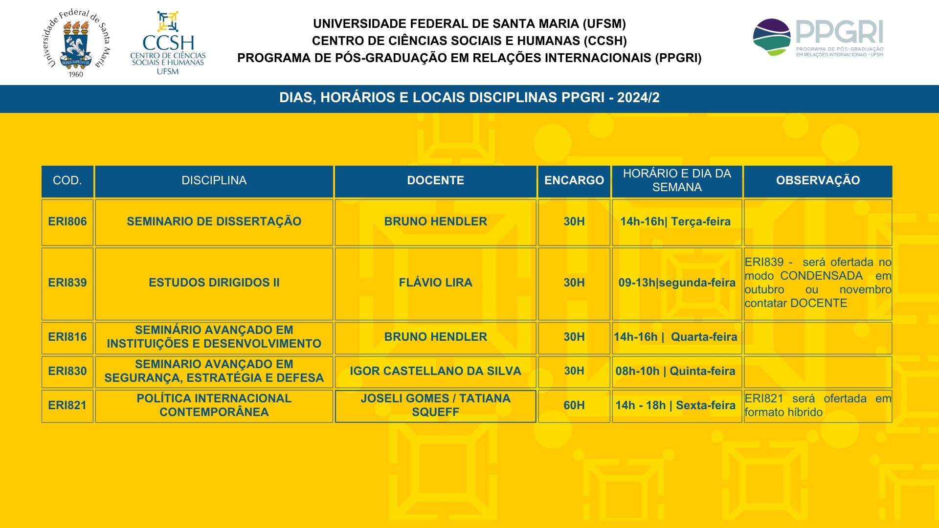 Horário das aulas de 2024-2 do Mestrado em Relações Internacionais