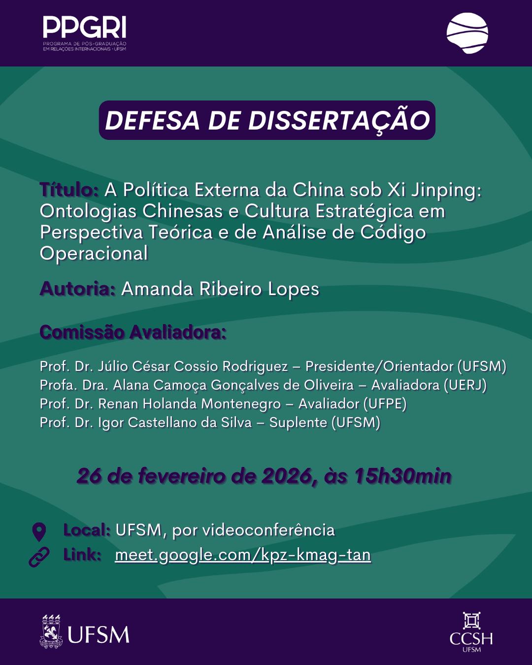 O Programa de Pós-Graduação em Relações Internacionais divulga a defesa de dissertação da aluna Amanda Ribeiro Lopes com o título “A Política Externa da China sob Xi Jinping: Ontologias Chinesas e Cultura Estratégica em Perspectiva Teórica e de Análise de Código Operacional”, que ocorrerá no dia 26 de fevereiro de 2026, às 15 horas e 30 minutos.