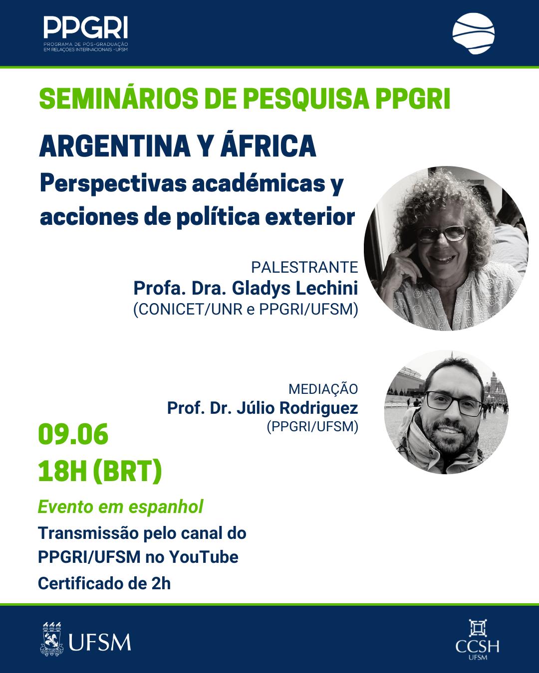 2º Encontro dos Seminários de Pesquisa do PPGRI/UFSM. Neste encontro, a ocorrer no dia 9 de junho, às 18h (BRT), a Profa. Dra. Gladys Lechini, docente vinculada ao CONICET-UNR e professora colaboradora do PPGRI/UFSM, ministrará a palestra intitulada “Argentina y África: Perspectivas académicas y acciones de política exterior”. A palestra será proferida em espanhol.