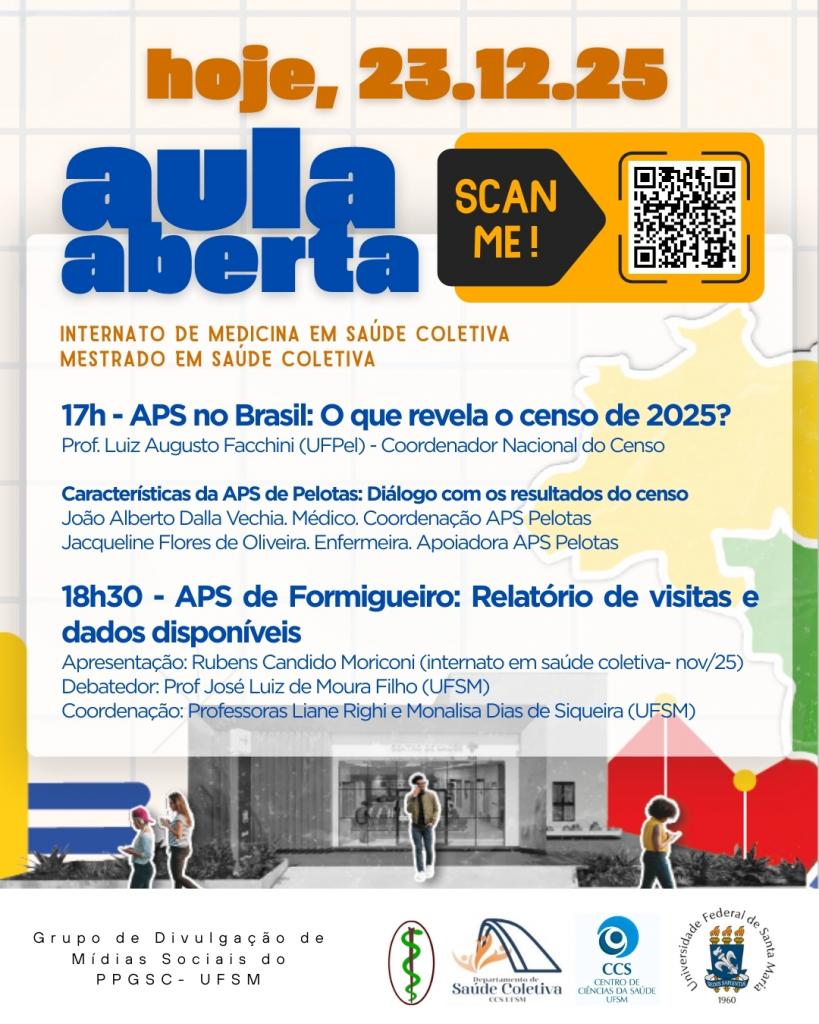 O Programa de Pós-Graduação em Saúde Coletiva (PPGSC) da UFSM, em conjunto com o Internato de Medicina em Saúde Coletiva, realiza nesta terça-feira, 23 de dezembro, uma aula aberta especial voltada a discentes, docentes e profissionais da rede de saúde. O evento contará com a participação de especialistas para debater o cenário atual da Atenção Primária à Saúde (APS) no Brasil e experiências locais.