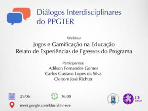 No dia 29/06, ocorreu o primeiro Diálogo Interdisciplinar de 2020, totalmente online. Na ocasião, três egressos convidados, Adilson Fernandes Gomes, Carlos Gustavo Lopes da Silva e Cleitom José Richter, apresentaram relatos de experiência envolvendo o uso e desenvolvimento de jogos e gamificação no contexto educacional, em seus projetos de pesquisa, bem como em suas trajetórias profissionais pós-defesa.