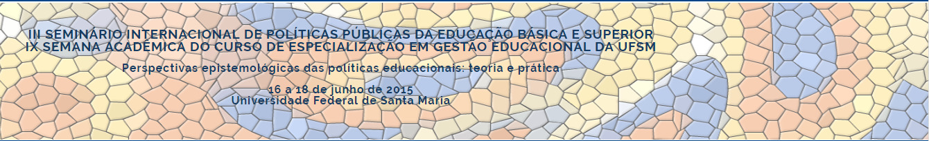 O III Seminário Internacional de Políticas Públicas da Educação Básica e Superior e a IX Semana acadêmica do curso de Especialização em Gestão Educacional da Universidade Federal de Santa Maria, programados para acontecer no período de 16 a 18 de junho de 2015, configuram-se como eventos integrados acerca do tema geral “PERSPECTIVAS EPISTEMOLÓGICAS DAS POLÍTICAS EDUCACIONAIS: TEORIA E PRÁTICA”.