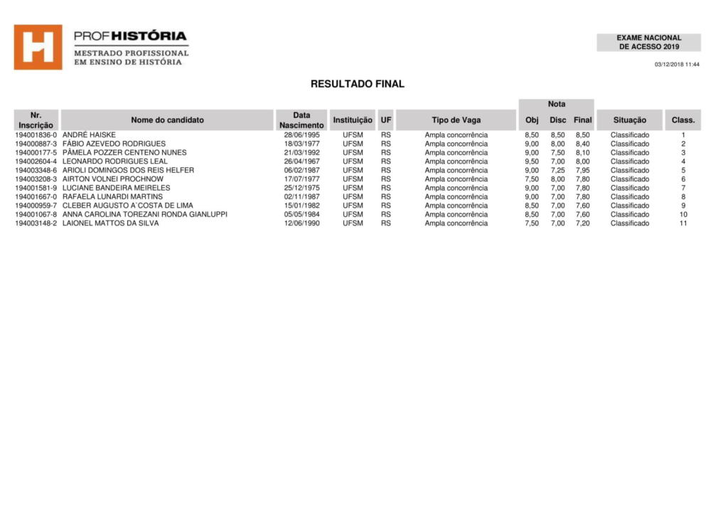 Informamos os aprovodos no Exame Nacional de Acesso 2019 do ProfHistória realizado no dia 21/10.