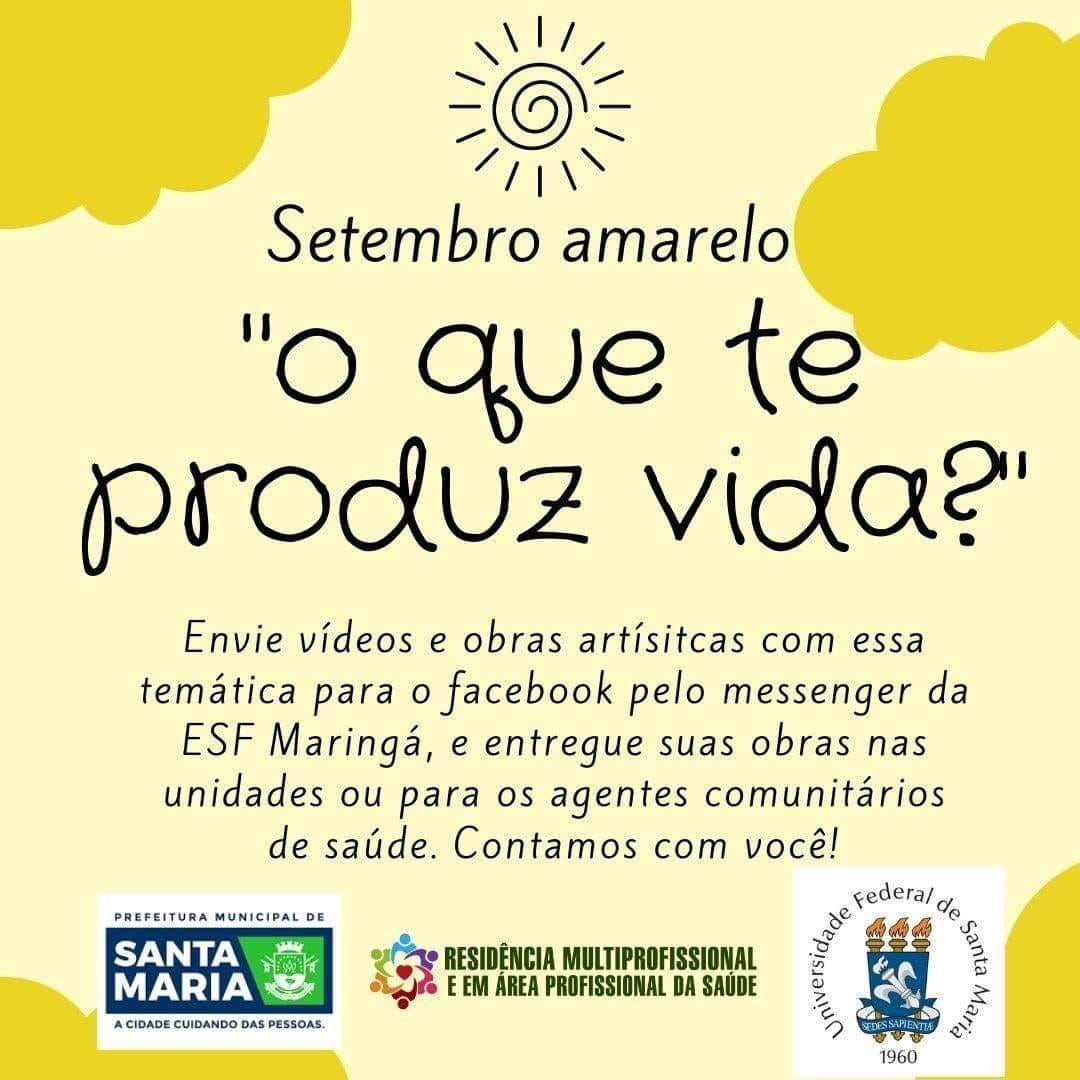 Olá, em nome da ESF Maringá e ESF São Francisco, viemos convidá-los para participar de uma ação de promoção e valorização da vida, durante o mês de setembro, que irá ocorrer nas quartas-feiras pela manhã. O tema desse ano é “O que te produz vida?”. A partir disso, serão elaborados vídeos e exposições de criações artísticas da população do território. Os vídeos serão divulgados na página do Facebook e as exposições ocorrerão nas recepções das unidades, durante toda a manhã para o público já presente, evitando aglomerações e seguindo as orientações do Ministério da Saúde. A composição dos vídeos e das criações é livre, podendo conter poesias, músicas, dança, artesanatos, dicas, receitas, falas, imagens, pinturas, entre outros, use sua criatividade. Os vídeos devem ser enviados para o Facebook da ESF Maringá pelo Messenger, com no máximo dois minutos de duração e as obras poderão ser entregues nas unidades ou para os respectivos agentes comunitários de saúde.