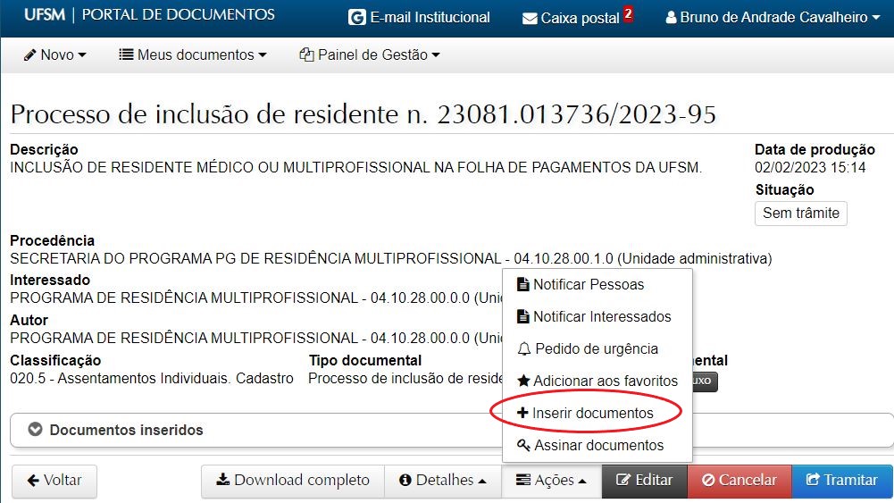 3) Clicar em “Ações” e após “Inserir documentos“;