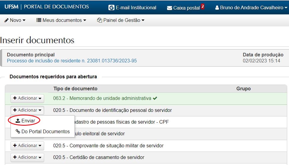 4) Na janela seguinte aparecerá a lista de documentos necessários. Os passos 4 e 5 devem ser repetidos até a inclusão de todos os documentos exigidos.