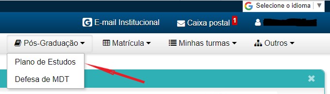 Depois, clicar no menu Pós-Graduação, submenu Plano de Estudos.