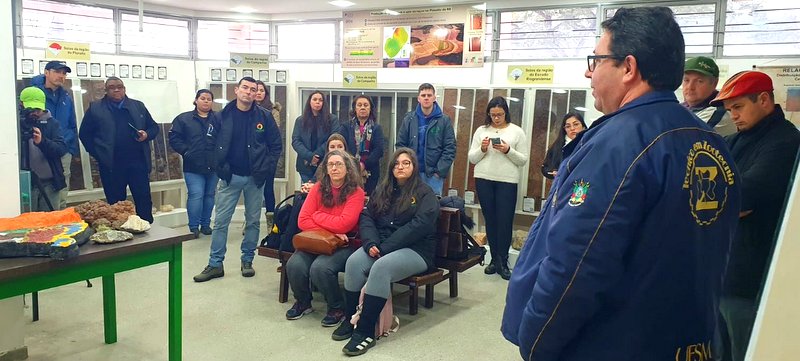 Na parte da manhã, os alunos tiveram a oportunidade de visitar o renomado Museu de Solos da UFSM, onde foram conduzidos em uma aula pelo Prof. Adão Leonel Mello Corcini, especialista na disciplina de Uso e Manejo em Solos de Pomares. Durante a visita, os estudantes puderam visualizar e conhecer os diferentes tipos de solo presentes na região, compreendendo como cada um deles influencia diretamente no cultivo de frutíferas. Essa abordagem prática proporcionou aos alunos uma conexão entre a teoria e a realidade, agregando uma nova dimensão ao aprendizado.