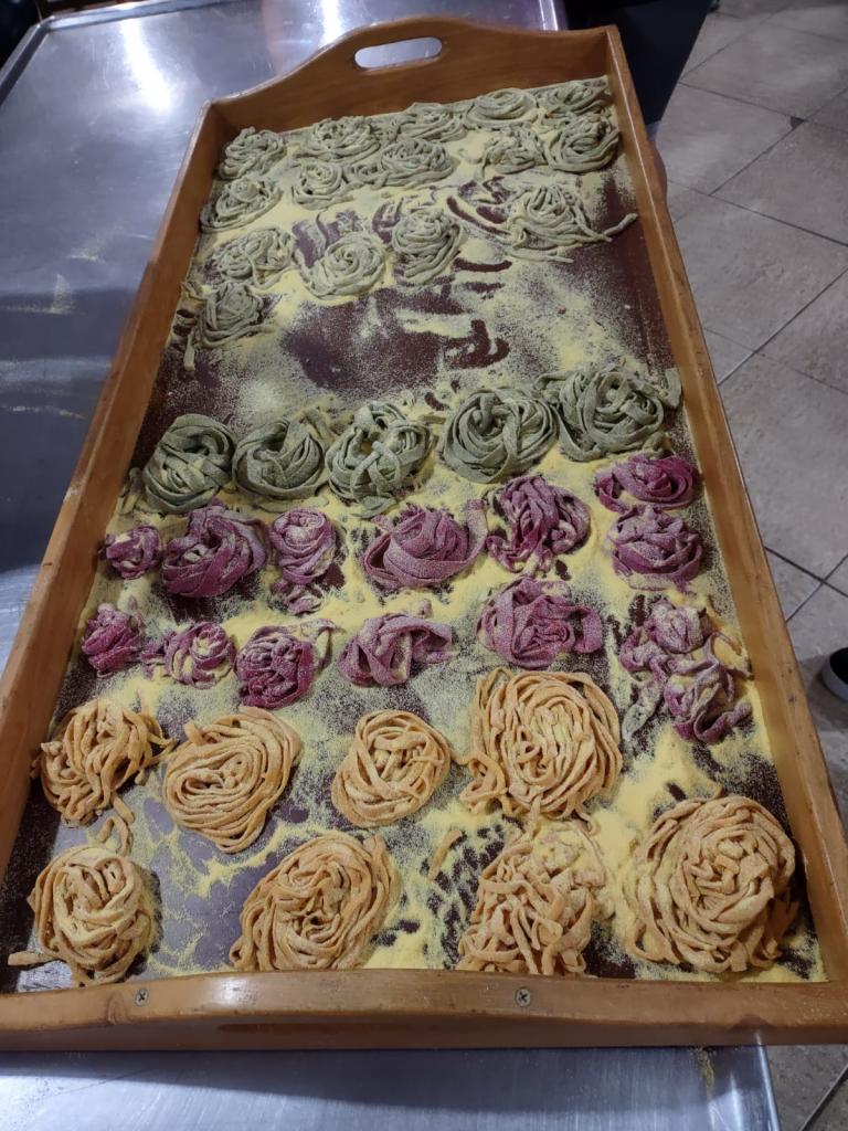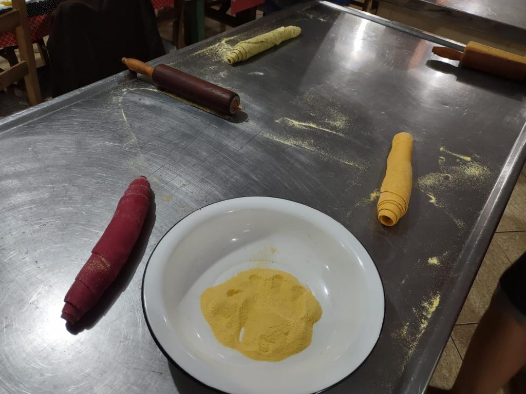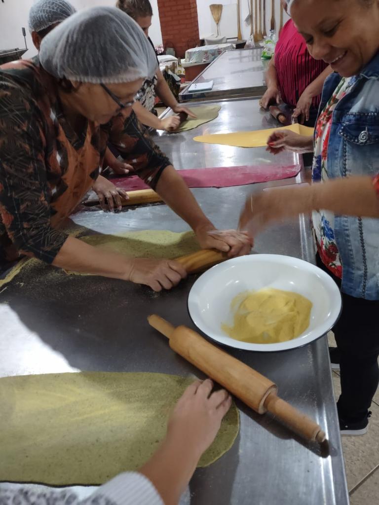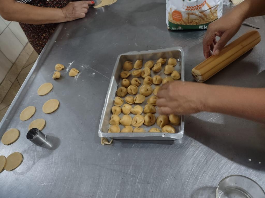 As aulas teórico-práticas foram conduzidas nas dependências do Salão Paroquial, o qual dispõe de utensílios e equipamentos indispensáveis para o bom andamento da capacitação, cujo objetivo é fortalecer a culinária da Quarta Colônia incentivando à produção local. Na oportunidade foi demonstrado o processo de elaboração de cucas, seus respectivos recheios e cobertura. Também foram elaboradas massas frescas como talharim, agnolini, ravioli e tortelli. As cursistas tiveram a oportunidade de praticar as formulações sugeridas, tanto de cucas como de massas frescas coloridas naturalmente com vegetais, as quais foram disponibilizadas no material didático entregue.